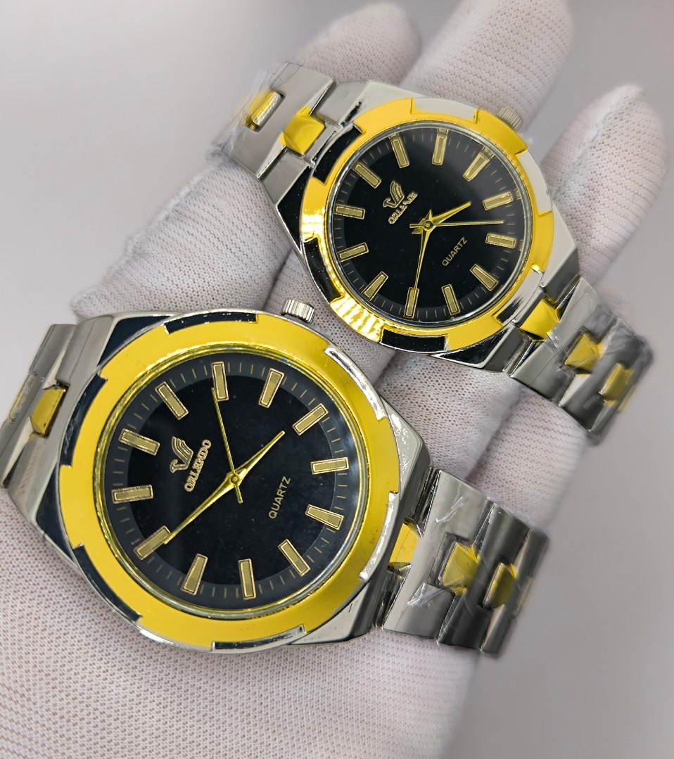 ست ساعت مچی زنانه و مردانه اورلیندو با طراحی صفحه دایرهای و موتور کوارتز دقیق انتخابی شیک و هماهنگ برای زوجهاست بند استیل رنگ ثابت با قفل مخفی ضامندار راحتی و دوام را تضمین میکند صفحه ضد خش و مقاومت صد درصدی در برابر آب این مدل را برای استفاده روزمره و رسمی مناسب کرده است این ست جذاب را میتوانید از فروشگاه اینترنتی روبی مد تهیه کنید و از کیفیت و هماهنگی آن لذت ببرید.