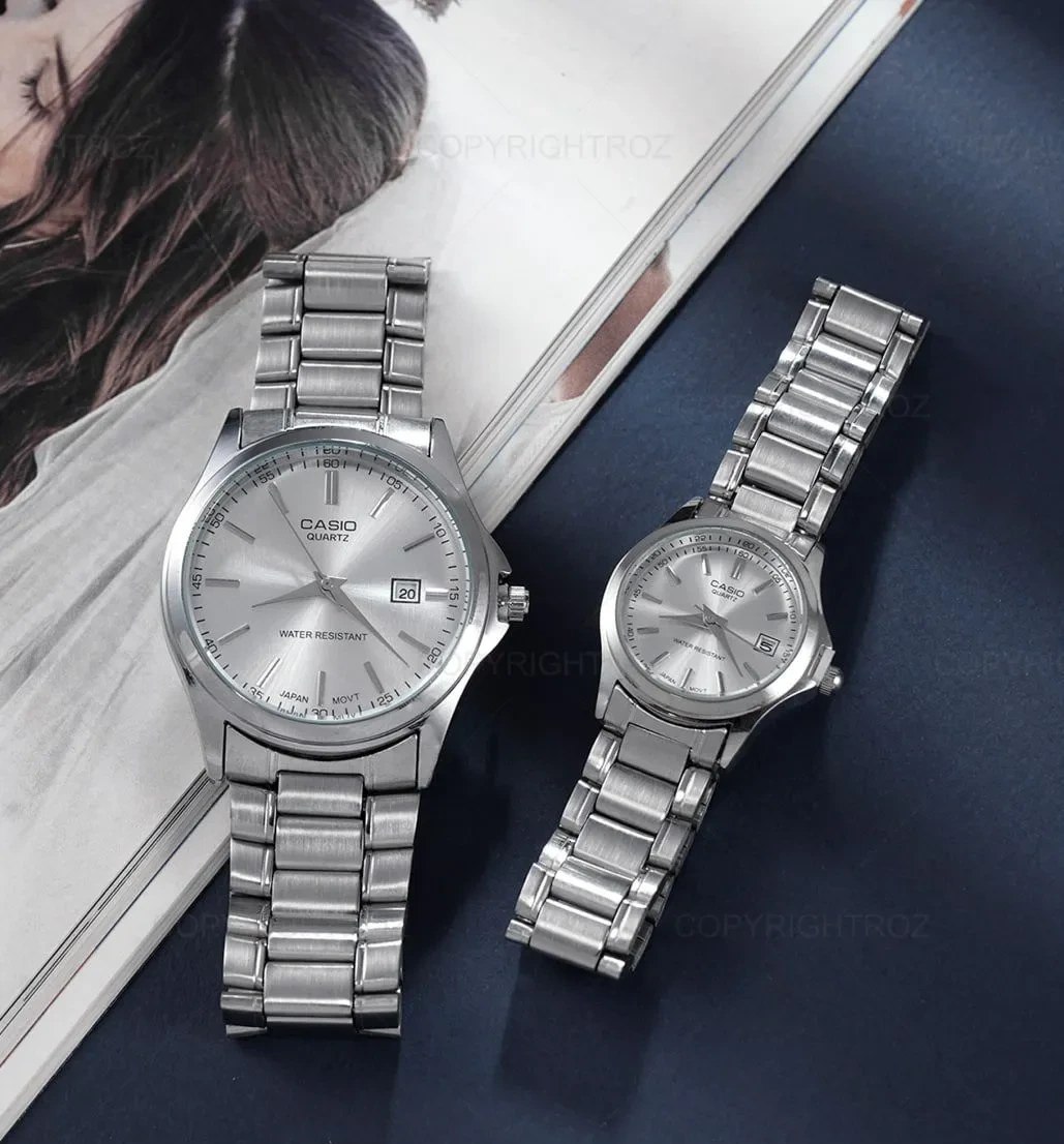 ست ساعت مچی زنانه و مردانه کاسیو CASIO انتخابی خاص برای زوج هایی است که به سبک کلاسیک و کیفیت سفارشی اهمیت میدهند این ست با بند استیل مقاوم و رنگ سیلور طراحی شده و دارای قفل کلیپسی راحت و ایمن است موتور کوارتز دقیق و قابلیت روز شمار آن کارایی روزمره را کامل میکند همچنین مقاومت در برابر آب خیال شما را آسوده میسازد فروشگاه اینترنتی روبی مد این ست کلاسیک را به عنوان گزینه ای شیک و کاربردی برای استایل هماهنگ شما پیشنهاد میکند.