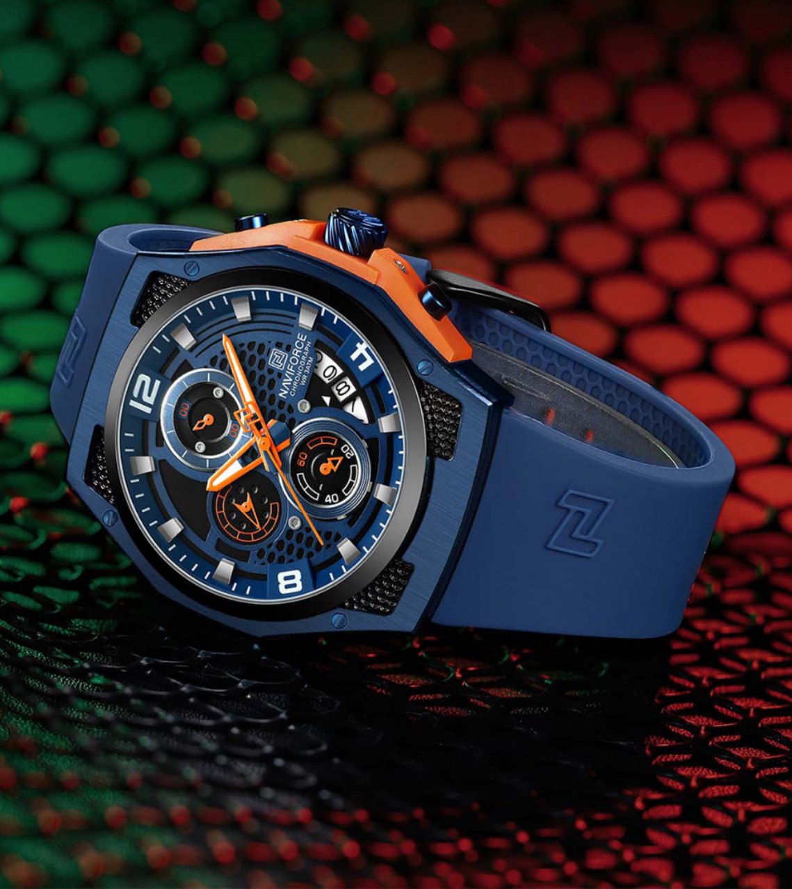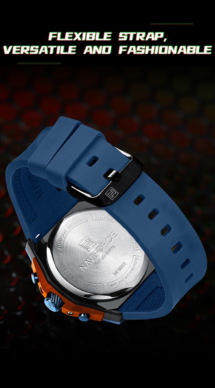 ساعت مچی کرنوگراف مردانه نیوی فورس NAVIFORCE مدل Nf8051t اورجینال با کارت گارانتی و جعبه انتخابی شیک و کاربردی برای آقایان است این ساعت سه موتوره کرنوگراف با موتور ژاپنی دقیق و تقویم دار طراحی شده و قاب استیل مقاوم همراه با عقربه شب تاب و قابلیت ضد آب دارد بند رابر سیلیکونی ضد حساسیت پوستی و شیشه معدنی ضد خش دوام و راحتی را تضمین میکند فرم صفحه دایره و قفل کمربندی سوزنی ظاهر کلاسیک و جذاب آن را کامل کرده است برای خرید این محصول میتوانید به فروشگاه اینترنتی روبی مد مراجعه کنید.