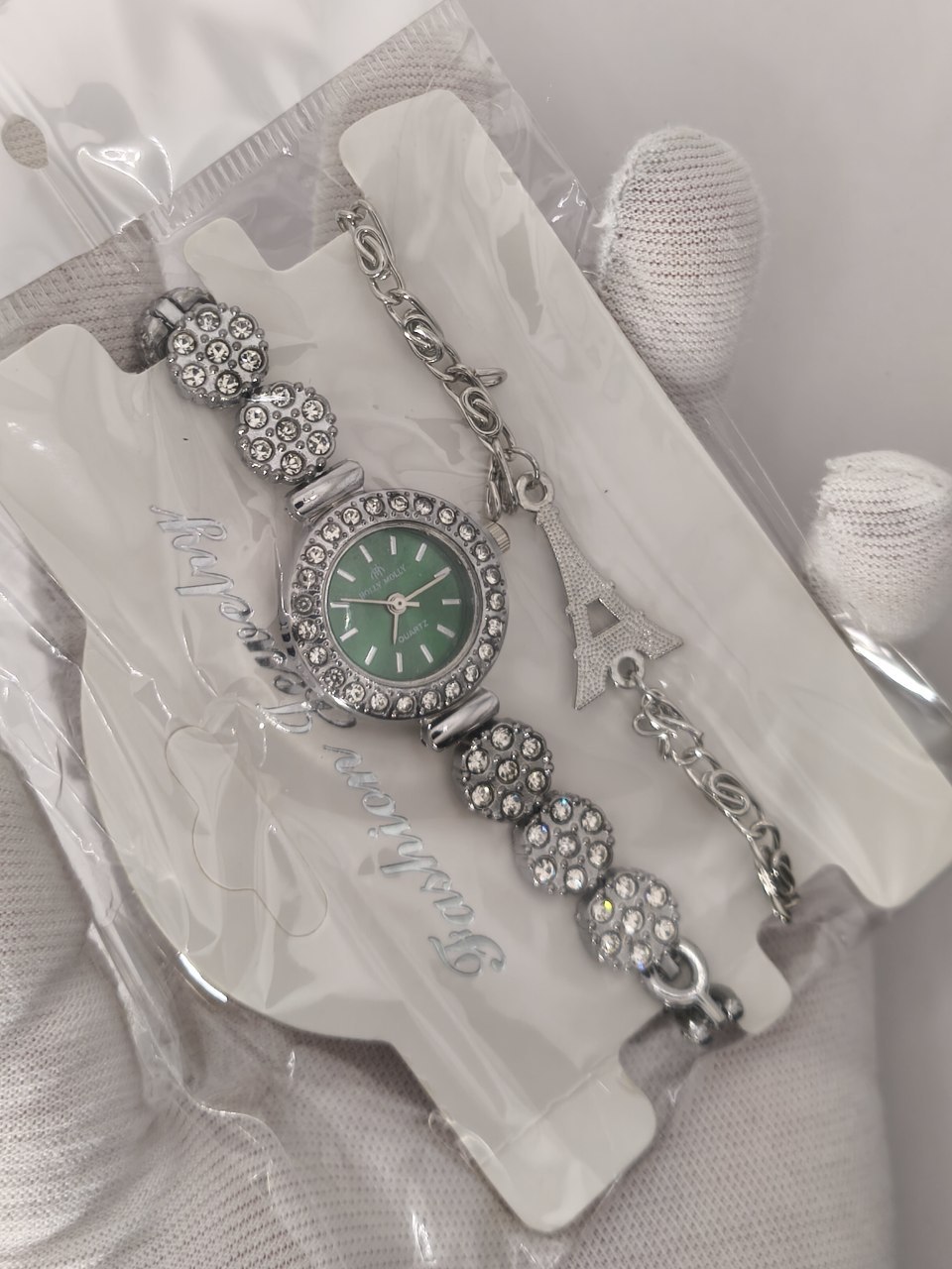 ست ساعت و دستبند دخترانه نگینی برند هولی مولی طرح ایفل انتخابی خاص و درخشان برای استایلهای مجلسی و شیک است این ست شامل ساعت و دستبند هماهنگ با طراحی یونانی و قاب نگینی طرح بند الماسی میباشد که جلوهای لوکس و متفاوت ایجاد میکند بند فلزی نگین کاری شده با قفل دستبندی راحتی استفاده و زیبایی را همزمان فراهم میسازد طراحی ظریف و مجلسی این ست آن را به هدیهای جذاب برای مناسبتهای خاص تبدیل کرده است برای خرید این محصول با بسته بندی مناسب هدیه به فروشگاه اینترنتی روبی مد مراجعه کنید.