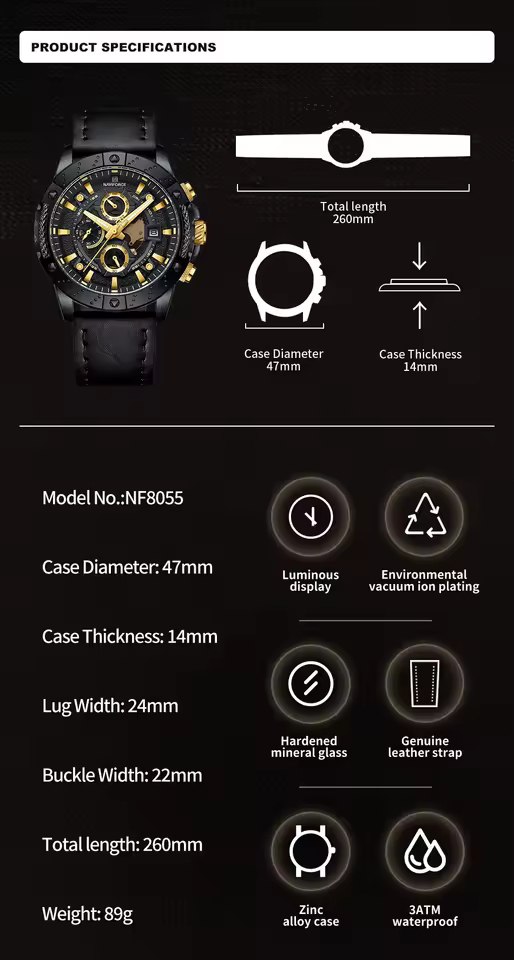 ساعت مچی کرنوگراف مردانه نیوی فورس NAVIFORCE مدل Nf8055 بند چرمی