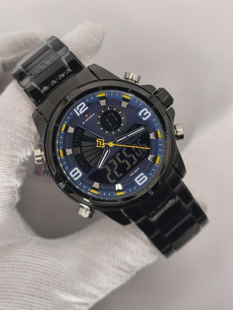 ساعت مچی کرنوگراف مردانه نیوی فورس NAVIFORCE مدل Nf9257 بند استیل با طراحی مدرن و کیفیت بالا انتخابی مناسب برای استایل رسمی و روزمره است این ساعت سه موتوره کرنوگراف ارجینال همراه با کارت گارانتی و جعبه عرضه میشود و مجهز به موتور ژاپن دقیق و قاب استیل مقاوم است شیشه معدنی ضد خش و عقربه شب تاب دوام و کارایی بالایی را تضمین میکند بند استیل رنگ ثابت ضد حساسیت پوستی با قفل کلیپسی ضامن دار راحتی و امنیت بیشتری فراهم میآورد فرم صفحه دایرهای ساده و جذاب جلوهای خاص به این مدل میدهد و قابلیت ضد آب آن استفاده روزانه را مطمئن میسازد ساعتی فراتر از زمان که میتوانید از فروشگاه اینترنتی روبی مد تهیه کنید.