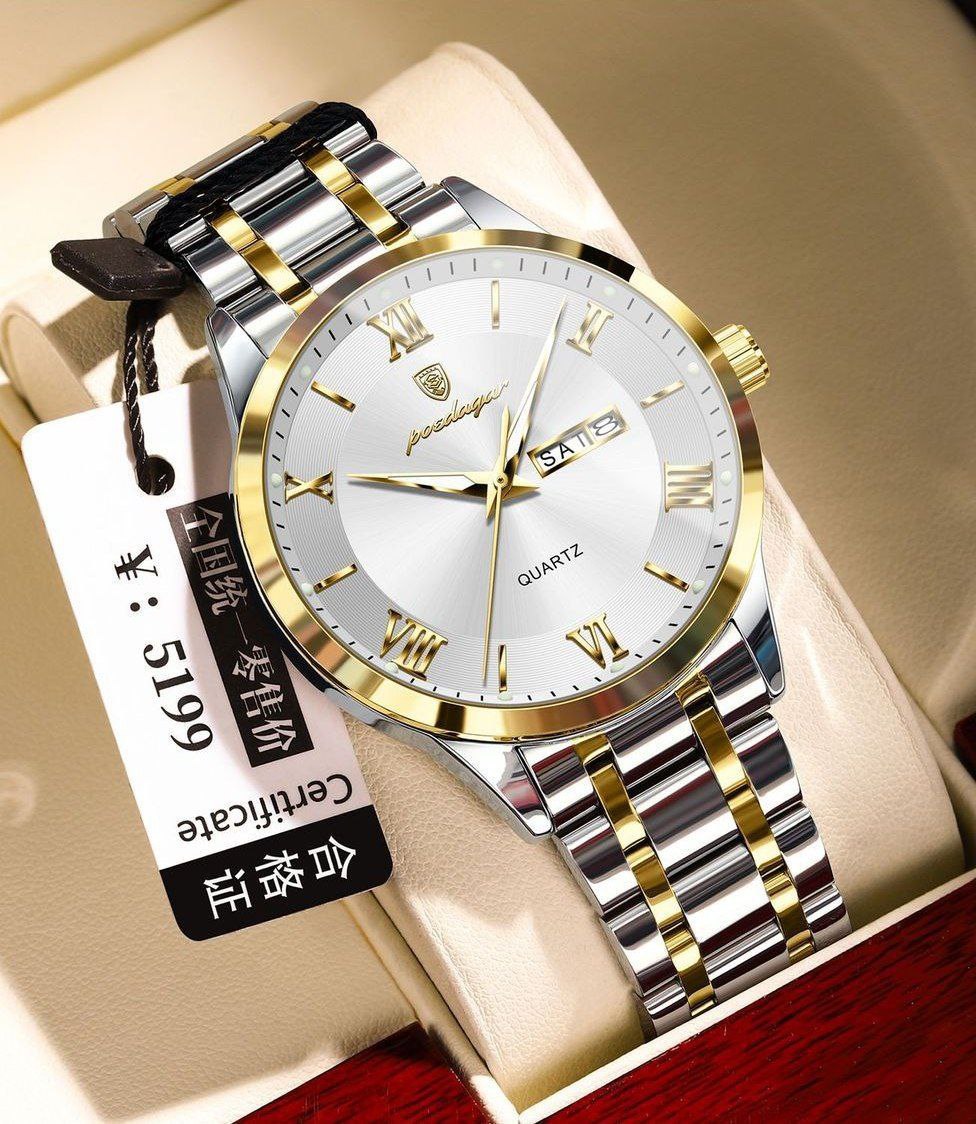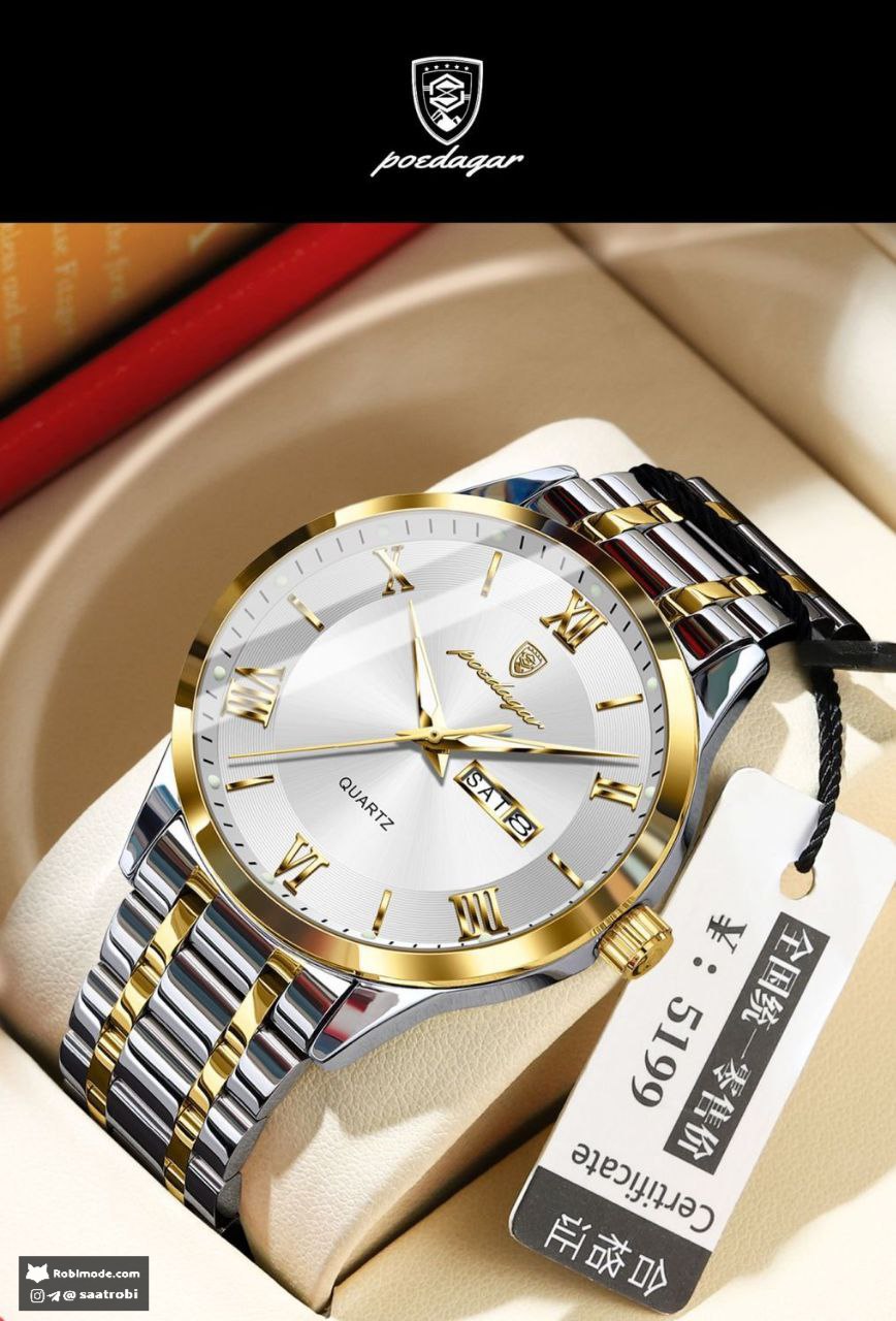 ساعت مچی مردانه پوداگار الماسی poedagar 2025 🏷️قیمت تخفیفی 1850 (ارسال رایگان) ❌ قیمت فروشگاه های دیگر 2.300+م🌈 بند استیل رگه طلایی صفحه سفید ▫️دارای روز شمار ▫️ایام هفته ▫️صفحه شب نما ▫️برند شرکتی ▫️بند استیل ▫️موتور کوارتز ▫️قطر صفحه ۴۲ میل▫️کریستال قاب یاقوت کبود▫️ضدآب تا عمق بالا▫️شیشه معدنی▫️رنگ ثابت ▫️قفل سگک دوپروانه ای☑️ خلق یک استایل جذاب و جدید