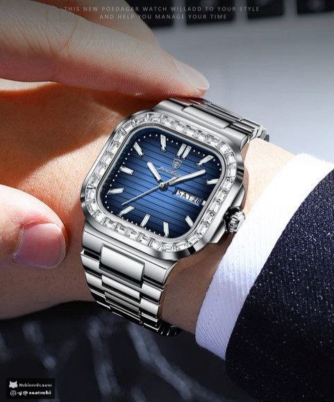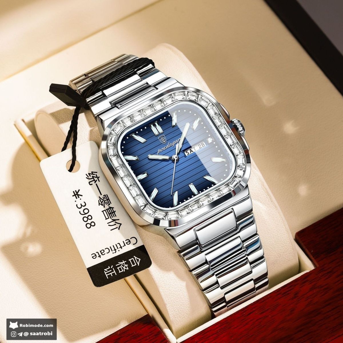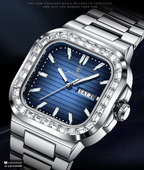 ساعت مچی ارجینال مردانه پوداگار الماسی poedagar ترکیبی از ظرافت و عملکرد با طراحی شرکتی و قاب کریستال یاقوت کبود قطر صفحه ۴۲ میلیمتری با شیشه معدنی مقاوم بند استیل با قفل سگک دوپروانهای و موتور کوارتز دقیق دارای صفحه شبنما نمایش روز شمار و ایام هفته ضدآب تا عمق بالا با رنگ ثابت و ماندگار این مدل خاص را از فروشگاه اینترنتی روبی مد تهیه کنید و استایل خود را حرفهایتر کنید.
